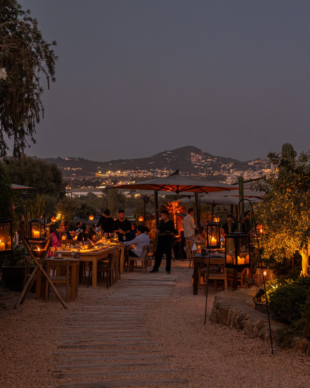 Stylish countryside restaurant and hotel concept known for Mediterranean cuisine and sunset views over Ibiza Town.